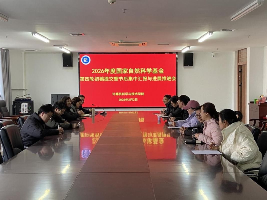2026年3月2日下午,计算机科学与技术学院召开2026年度国家自然科学基金项目第四轮初稿提交暨节后集中汇报与进展推进会。会议由副院长王建平主持,学院党委书记周启、院长高国红及全体基金项目申报教师参加会议。
