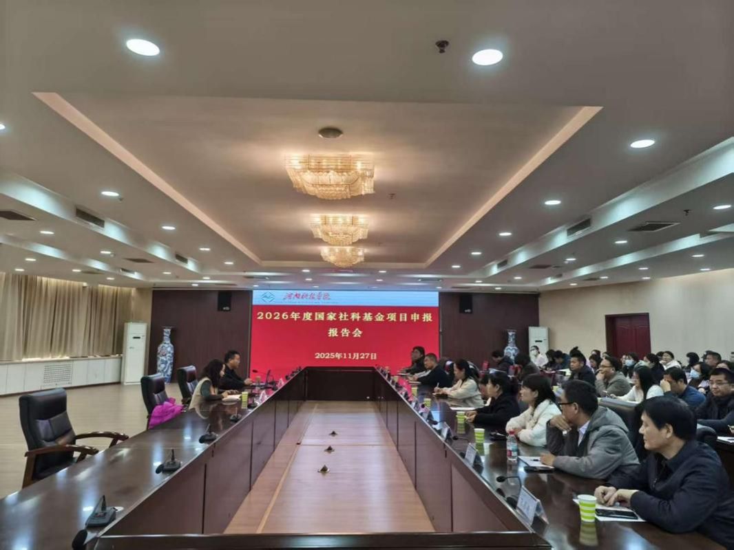 11月27日下午,我校在办公楼206会议室举办2026年度国家社科基金项目申报辅导报告会。讲座邀请河南中医药大学刘继刚教授作题为《2026年国家社科项目申报注意事项与论证规范》的报告。各文科学院院长、科研副院长、科研秘书和拟申报国家社科基金项目的老师参会,科技处副处长文平主持会议。